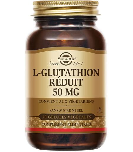Complément alimentaire à utiliser dans le cadre d’une alimentation variée, équilibrée et d’un mode de vie sain.Le L-glutathion est un tripeptide soufré composé de 3 acides aminés : acide glutamique, cystéine et glycine. Présent naturellement dans l'organisme, il sert notamment à former l'une de nos enzymes antioxydantes principales : la glutathion-peroxydase.IngrédientsÉlaboré avec ces ingrédients : cellulose microcristalline, hydroxypropylméthyl-cellulose, stéarate de magnésium végétal.Valeurs nutritionnellesChaque gélule végétale fournit :L-Glutathion (réduit) .................................................................................... 50 mgConseils d'utilisationComme complément alimentaire pour adultes, une (1) gélule végétale par jour, à avaler avec de l’eau ou du jus de fruit entre les repas. Respecter la dose recommandée.Précautions d'emploiConserver loin d’une source de chaleur ou d’humidité. A consommer avant le et lot N° voir sur le haut du flacon.Ne pas prendre en cas de grossesse, sauf sur avis d’un thérapeuthe. Ne pas laisser à la portée des enfants. Ne pas prendre en cas de grossesse, sauf sur avis d’un thérapeuthe.Les compléments alimentaires ne peuvent être utilisés comme substituts d’un régime alimentaire varié et équilibré et d’un mode de vie sain.Poids netFlacon de 30 gélules végétalesAdresse du FabricantSolgar Vitamins14 rue de Berlin77144 MontévrainFrance ...