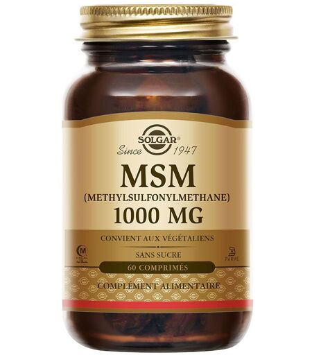Complément alimentaire à utiliser dans le cadre d’une alimentation variée, équilibrée et d’un mode de vie sain.Le soufre est un minéral très important de l'organisme. Il participe à la synthèse de protéines : kératine, élastine et collagène, et de mucopolysaccharides.Les mucopolysaccharides, appelés également glycosaminoglycanes (molécules constituées de protéines et de glucides), sont localisés dans le tissu conjonctif (tissu de soutien de l'organisme).Le MSM Opti MSM™ est une source brevetée de soufre hautement disponible.IngrédientsÉlaboré avec ces ingrédients : cellulose microcristalline, hydroxypropyle-cellulose, sels de magnésium d’acides gras, dioxyde de silicium, acides gras, hydroxypropylméthyl-cellulose, glycérol.Valeurs nutritionnellesChaque comprimé fournit :MSM* ........................................................1000 mg (méthylsufonylméthane)Conseils d'utilisationPour adulte, un (1) à deux (2) comprimés par jour à avaler de préférence au moment des repas. Respecter la dose journalière recommandée.Précautions d'emploiConserver loin d’une source de chaleur, de lumière ou d’humidité. A consommer avant le et lot N° voir sur le haut du flacon.Ne pas prendre en cas de grossesse ou d’allaitement, sauf sur prescription d’un thérapeute. Ne pas laisser à la portée des enfants.Les compléments alimentaires ne doivent pas remplacer une alimentation équilibrée.Poids netFlacon de 60 comprimésAdresse du FabricantSolgar Vitamins14 rue de Berlin77144 MontévrainFrance ...