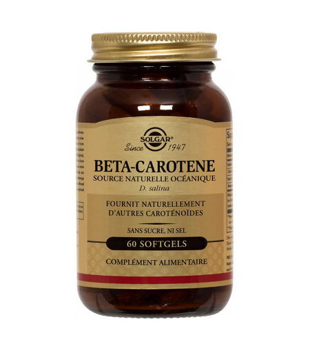 Pigment naturellement présent dans certains légumes, fruits ou algues, le bêta-carotène est aussi baptisé Pro-Vitamine A car il peut être transformé en rétinol (vitamine A) selon les besoins de l'organisme.La vitamine A contribue au maintien d'une peau normale.La vitamine A contribue au maintien d'une vision normale.La vitamine A contribue au fonctionnement normal du système immunitaire. Dosé à 7 mg par capsule, le bêta-carotène Solgar est extrait de l'algue Dunaliella salina. Ce produit est garanti sans sucre sel, gluten, blé, dérivés laitiers, soja, levure et sans conservateurs, arômes, colorants ou édulcorants artificiels. ...