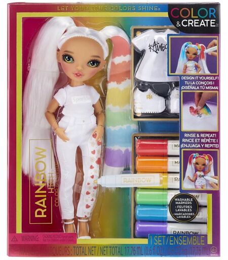 Rainbow High Color & Create - Yeux Verts MGA 500407 Rainbow High Color & Create - yeux verts - Êtes-vous assez créatif ? Ici, vous pouvez concevoir vous-même votre Rainbow High de la tête aux pieds. Caractéristiques principales La première poupée de mode DIY Rainbow High, dotée de cheveux blancs glamour et d'accessoires de mode. Les cheveux et les vêtements peuvent être personnalisés avec 6 marqueurs de couleur assortis. La peinture est lavable, vous pouvez donc créer, colorer et laver à l'infini. La poupée est habillée entièrement en blanc, avec des cheveux blancs. Elle est accompagnée d'un haut blanc, d'une paire de baskets blanches, d'un élastique pour les cheveux et de 6 marqueurs lavables aux couleurs de l'arc-en-ciel. Détails À partir de : 3 ans ...