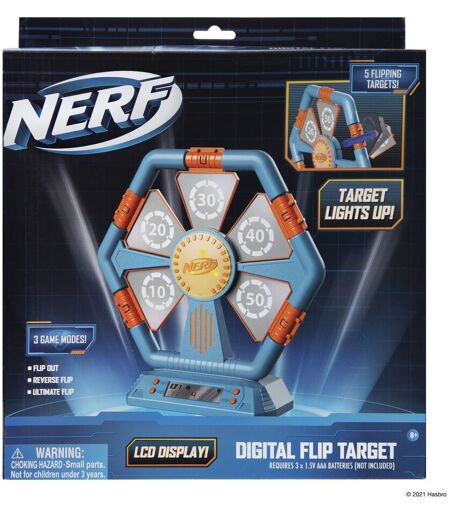 Perfectionnez vos tirs et développez votre adresse avec la cible électronique Nerf Flip ! Visez les 5 panneaux qui indiquent les scores. La cible dispose de 3 modes de jeu afin de changer si vous jouez seul ou avec des amis. ll faudra faire preuve de précision afin de remporter la partie. L'entrainement est la clé pour devenir un vrai tireur d'élite. Donnez à votre enfant l'occasion de s'améliorer où et quand il le souhaite avec la cible électronique Nerf. Un accessoire indispensable afin de jouer avec ses pistolets Nerf ! Nécessite 3 piles LR03 non incluses. ...