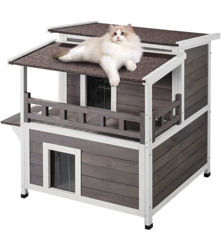 VEVOR Maison pour chat deexterieur resistante aux intemperies, abri spacieux en bois a deux niveaux pour chats sauvages, comprend un balcon, des entrees,