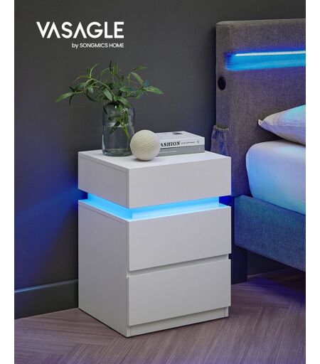 Table de Chevet Moderne avec Lumières LED LED Mode et Couleur Réglables Les lumières LED intégrées à la table de nuit se déclinent en 25 couleurs, avec 6 niveaux de luminosité, 10 modes et 6 fréquences de clignotement. Grâce à la télécommande, vous pouvez les ajuster pour créer différentes atmosphères. Grande Capacité de Rangement Dotée de 3 tiroirs spacieux et d'un grand plateau, cette table de chevet est idéale à côté du lit pour ranger des journaux dans les tiroirs. Le réveil et les cadres photo trouveront parfaitement leur place sur le plateau. Polyvalente Grâce à ses lumières et à son design moderne, elle peut servir de table de chevet pour la chambre, de table pour le salon ou de caisson pour le bureau. Un adaptateur et un câble de 1,8 m sont inclus. Structure Stable et Robuste Fabriquée en panneau d¿aggloméré de 15 mm, cette petite table basse est stable et robuste. Sa capacité de charge totale est de 110 kg. Montage Facile Avec des instructions claires, outils inclus et pièces numérotées, le montage est rapide et simple. Caractéristiques : Couleur : Blanc Matériau : Panneau d¿aggloméré Dimensions : 35 x 40 x 55 cm (P x L x H) Poids : 15,4 kg Capacité de charge statique maximale du tiroir supérieur : 2,3 kg Capacité de charge statique maximale du tiroir inférieur : 3,4 kg Capacité de charge statique maximale totale : 110 kg Livraison : 2 x Tables de chevet 1 x Kit de montage 1 x Mode d¿emploi ...