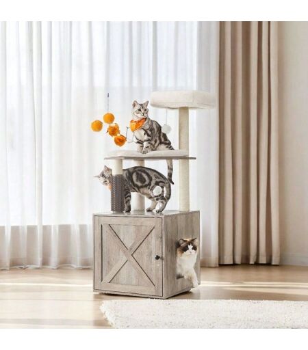Feandrea Arbre À Chat Avec Maison De Toilettes, Niche Pour Chat De 134 Cm Avec Chache-Litière, Poteaux À Griffer, Perchoir, Grège