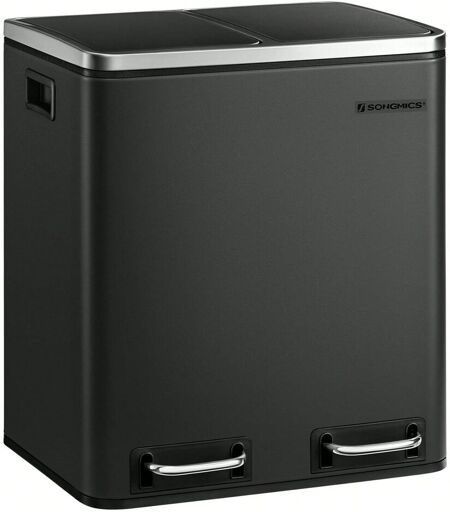 Songmics Poubelle Tri Sélectif 2 Bacs, 2 X 15l, avec seaux Intérieurs et Poignées, Fermeture Lente, Noir