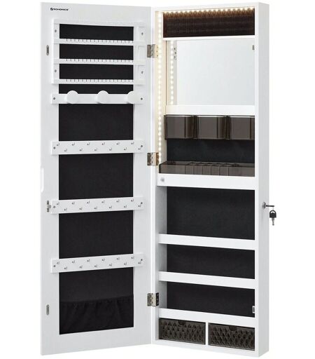 Songmics Armoire À Bijoux Murale, Avec Lumières Led, Avec Miroir Sans Cadre, 2 Tiroirs, Verrouillable, Blanc
