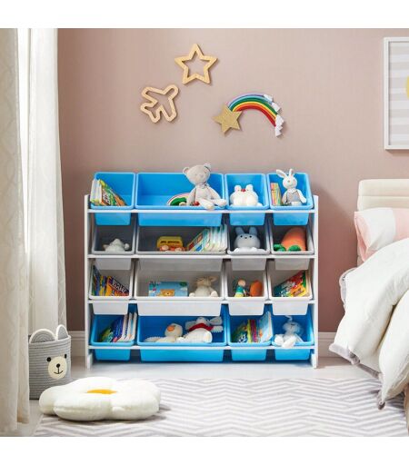 Songmics Meuble De Rangement Enfant - 4 Niveaux - 16 Bacs - Blanc, Bleu Et Gris