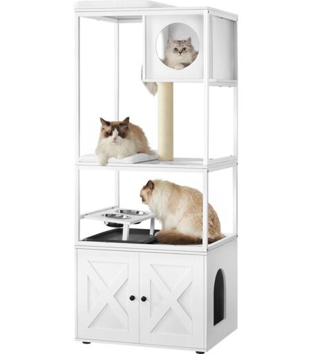 Feandrea - Arbre à Chat, Maison pour Chat avec Cache-litière, Gamelles Surélevées, Poteau à Griffer en Sisal, Tapis Lavables, Blanc Nuage