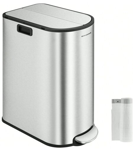 Songmics Poubelle de cuisine, 30L et 20L, Poubelle Mince 2 compartiments pour tri et Recyclage des Déchets, Argent Métallique