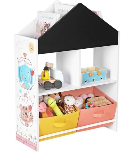 TOUT-EN-UN : 4 emplacements pour des jouets, 2 étagères pour des livres, 2 bacs en tissu non-tissé pour des fournitures et 1 tableau noir à l'avant du toit... Ca en fait de quoi s’amuser et dessiner à l’infini ! SURPRISE EN HAUT : Chut ! Ne le dites pas tout de suite à vos enfants ! Ils seront trop contents de découvrir tout seuls que les séparateurs des deux côtés du petit toit son amovibles ! Envie d’en faire un grand compartiment ? Il suffit de les retirer ! LEUR SÉCURITÉ, NOTRE PRIORITÉ : Parce que la sécurité de vos tout-petits compte le plus, ce meuble pour enfants fait de panneau d'aggloméré est équipé d'un kit anti-basculement pour qu’ils puissent s’amuser sans danger TOUT À PORTÉE DE MAIN : Vous verrez le sourire de vos enfants s’illuminer lorsqu’ils pourront attraper tout ce qu’ils aiment grâce aux bacs du bas inclinés et aux dimensions idéales de ce meuble. Dessiner sur le tableau ? Aucun problème de taille ! POUR LE PLAISIR DES YEUX : Avec un cadre blanc telle une maison, ...