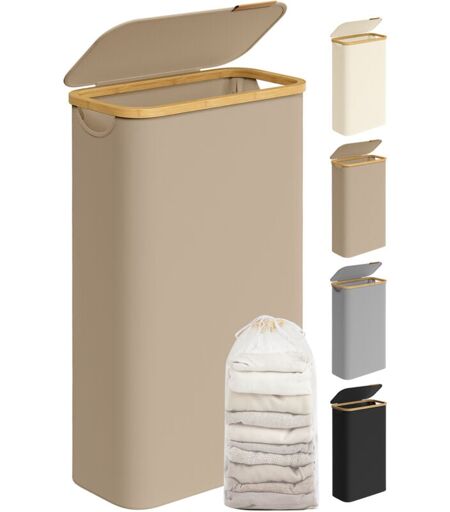 [Gain de place] Ce panier à linge mince de 65L, mesurant 42 x 22,5 x 70,5 cm, est spécialement conçu pour s'adapter aux espaces étroits, ce qui en fait un panier à linge idéal pour les petites surfaces de vie ou les buanderies compactes [Couvercle pratique avec poignée] Le panier à linge est doté d'un couvercle qui éloigne la poussière et protège aussi l'intimité en dissimulant le désordre. Le logo en PU sert de poignée pour une ouverture facile, ajoutant une touche élégante [Doublure amovible et polyvalente] La doublure, fixée avec des scratchs, peut être facilement retirée, et ses cordons servent également de poignées pour un transport pratique. Sa conception en maille lui permet de servir de sac de lavage pour le tri du linge dans la machine [Résistant et solide] Fabriqué en tissu Oxford épais 600D, le panier à linge offre une résistance à l'eau, à la déchirure et un nettoyage facile. Sa structure interne, soutenue par des tiges en fibre de verre, assure une utilisation fiable ...
