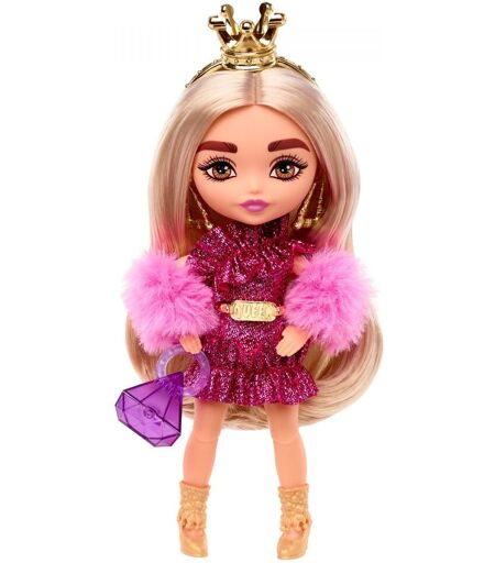 Découvrez les plus extras des poupées Barbie : les Minis Extra. Elles sont comme les grandes poupées Barbie Extra, mais avec quelques centimètres en moins ! Ces petites poupées de 14 cm peuvent prendre une multitude de poses. Surtout, elles ont une personnalité qui se démarque et un look qui en jette. Chacune d'entre elles a une chevelure extralongue réaliste, une tenue originale et des accessoires exubérants. Grâce à leurs coudes et genoux articulés, ces petites poupées sont prêtes à prendre la pause ! Chacune s'accompagne d'un socle pour que les enfants puissent créer leur propre exposition de Minis Barbie Extra ! Petites par la taille, elles ont une immense personnalité. Surprenantes, non ? Articles vendus séparément. Certains produits peuvent ne pas être commercialisés. Les poupées ne tiennent pas debout toutes seules. Les couleurs et les décorations peuvent varier. Les poupées Mini Barbie Extra font 14 cm et ont un look qui en jette, avec une tenue et des accessoires qui sortent du lot. Elles sont aussi fournies avec un socle spécial pour mettre en valeur votre Mini Barbie Extra ! Cette Barbie Extra Mini a de très longs cheveux blonds ondulés et porte une tiare dorée, une robe à volants rouge brillant accompagnée de mitaines en fausse fourrure rose et des chaussures serties de " pierres précieuses ". Elle peaufine son look avec des accessoires comme sa ceinture dorée rehaussée de l'inscription " QUEEN ", ses boucles d'oreilles dorées et sa pochette en forme de diamant violette ! Grâce au socle inclus et à ses coudes et genoux articulés, cette petite poupée est idéale pour imaginer des histoires de mode ou créer une exposition Mini Barbie Extra. Les poupées Minis Barbie Extra sont un cadeau idéal pour les enfants de 3 à 10 ans, surtout s'ils aiment se démarquer ! Inclut une poupée Barbie de la collection Extra Mini (14 cm) portant une robe, des mitaines, des chaussures, une ceinture, une tiare et des boucles d'oreilles, 1 sac à main et 1 socle pour poupée. Attention : Ne convient pas aux enfants de moins de 36 mois. ...