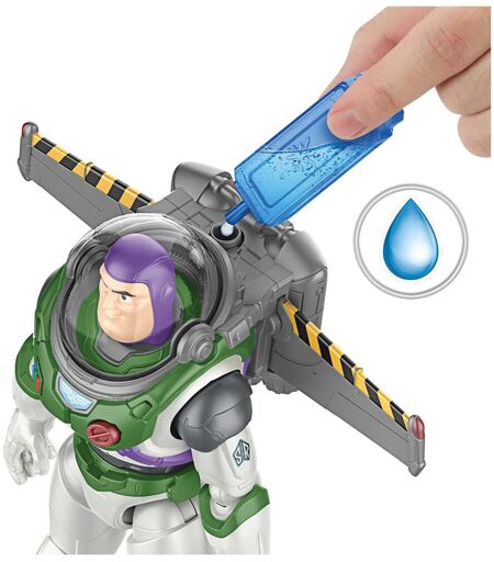 Recréez des aventures captivantes mêlant exploration spatiale, combats épiques et travail d'équipe grâce à cette figurine aux détails fidèles représentant Buzz l'Éclair, le Ranger de l'Espace emblématique star du film éponyme de Disney · Pixar, ici accompagné de son jet pack pour décoller vers de nouvelles aventures ! Remplissez la cartouche de la fusée avec de l'eau et fixez-la sur la figurine, puis équipez Buzz de son casque et lancez le décollage impressionnant avec sons, lumières et traînée de vapeur réaliste, pour encore plus d'action ! Even small hands can use this figure to recreate dynamic flight scenes and signature moves with 12 posable joints, detailed design and movie-related lights and sounds! Les fans pourront réunir tous les membres de l'équipe de Buzz l'Éclair pour créer une collection grand format impressionnante. Revivez toutes les aventures de la célèbre saga spatiale ! Articles vendus séparément. Certains produits peuvent ne pas être commercialisés. Ce Buzz l'Éclair avec décollage impressionnant est une excellente idée de cadeau pour les amateurs de figurines articulées et les fans de Buzz l'Éclair à partir de 4 ans. Découvrez l'univers Buzz l'Éclair de Disney · Pixar. Bloqués sur une planète inconnue, Buzz l'Éclair et ses camarades devront combattre des plantes hostiles, des insectes géants et la menace ultime, Zurg, pour terminer leur mission et rentrer chez eux. Cette grande figurine articulée représente Buzz l'Éclair dans sa célèbre tenue de Ranger de l'Espace Alpha avec jet pack. Remplissez la cartouche de la fusée avec de l'eau et fixez-la sur la figurine, puis équipez Buzz de son casque et déployez les ailes (24 cm d'envergure) de son jet pack pour le voir s'envoler. En décollant, Buzz émet des sons et des lumières ainsi qu'une traînée de vapeur plus vraie que nature, pour inspirer des aventures héroïques encore plus réalistes ! La figurine émet des sons et lumières inspirés des aventures à l'écran pour s'amuser encore plus. Ce jouet de qualité de 30 cm présente des détails fidèles et 12 points d'articulation, pour mieux reproduire une multitude de poses et de scènes du film. Les couleurs, les dimensions et les décorations peuvent varier. ...
