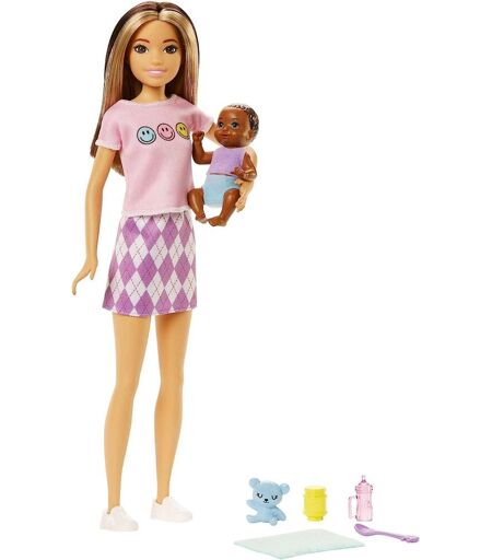 Mattel Barbie Coffret Poupée Skipper Baby-Sitter Brune, Avec Figurine De Bébé Et 5 Accessoires