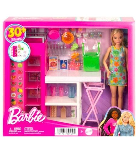 Barbie HJV38. Type de produit: Accessoires de poupée, Age recommandé (min): 3 an(s) Les enfants vont adorer s'amuser avec Barbie et son garde-manger ! Avec tous ses accessoires de cuisine, ce coffret captivant peut s'utiliser seul ou venir compléter une maison de poupée. La poupée Barbie porte une robe à fleurs et un tote bag qu'elle adore emmener au marché ou chez l'épicier. If the kitchen is the heart of the home, then the pantry is the foundation of the kitchen! Open the refrigerator's door to organize food or slide out the hidden pantry shelves. L'îlot central de cuisine est idéal pour préparer le repas et s'installer pour manger. La desserte indépendante permettra de servir tous ces succulents plats ! Le coffret garde-manger inclut plus de 30 accessoires de jeu, comme des ¿ufs, des légumes et de la vaisselle, ainsi qu'une adorable feuille de stickers nourriture pour que les enfants s'amusent à personnaliser leur cuisine ! Ce garde-manger Barbie est une excellente idée de cadeau pour les enfants de 3 ans et plus, qui pourront laisser libre cours à leur imagination et reproduire des mises en scène réalistes ! ...
