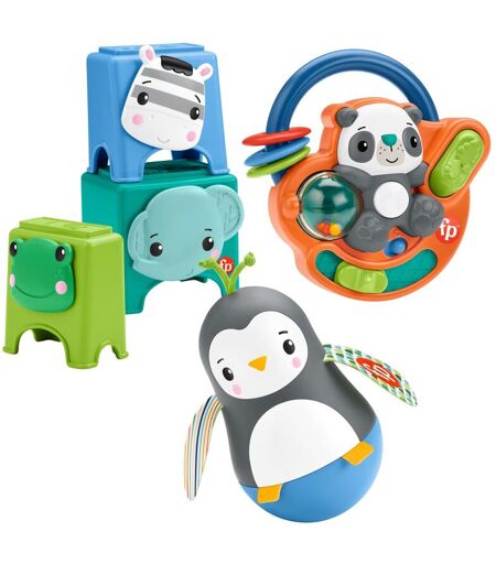 Dès 6 mois-Ce coffret Je Découvre mes Mains de Fisher-Price est un coffret cadeau composé de 3 jouets d'éveil spécialement sélectionnés pour renforcer la motricité fine de bébé, et fourni avec des conseils d'experts en développement de l'enfant du Fisher-Price Play Lab. Ce coffret inclut un panda électronique à poignée avec musique, sons et activités amusantes un manchot culbuto et un lot de trois blocs animaux à empiler et emboîter. Conçu pour les bébés de 6 mois et plus, ce coffret de jeu est idéal pour développer la motricité fine à travers des activités d'empilement et de manipulation basées sur la relation de cause à effet. ...