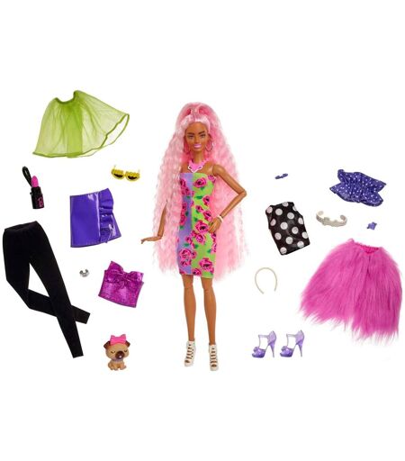 Les poupées Barbie Extra affichent un look audacieux aux couleurs vives et l'assument à 100 % ! Cette poupée Barbie Extra vient bouleverser la mode avec son assortiment d'habillages et d'accessoires qui en jettent, pour créer plus de 30 looks adaptés à toutes les occasions. La poupée Barbie Extra incluse dans le coffret n'a pas froid aux yeux, comme en témoigne son look : chevelure extra-longue rose ondulée avec une demi-queue. Les enfants pourront imaginer encore plus de looks inédits et audacieux grâce aux pièces incluses : une robe, un manteau de fourrure, trois hauts, un pantalon, une jupe, deux paires de chaussures et 10 accessoires ! La figurine de carlin qui l'accompagne ne manque pas non plus de personnalité avec son collier et son noeud sur la tête. Avec ses 11 points d'articulation, cette poupée peut prendre la pose et faire sensation partout où elle va ! La poupée ne tient pas debout toute seule. Les couleurs et les décorations peuvent varier. Ce coffret Barbie Extra avec poupée et habillages offre l'occasion d'explorer les tendances actuelles en mélangeant et combinant plus de 15 accessoires de mode, offrant plus de 30 looks extraordinaires ! Les enfants pourront exprimer la personnalité non conformiste de cette Barbie grâce aux vêtements glamour inclus dans le coffret, comme un manteau en fourrure rose, une robe fleurie, une jupe en vinyle, un pantalon noir et trois hauts à pois, à volants et à noeud. La poupée est aussi fournie avec des accessoires qui ne passent pas inaperçus : un sac à main en forme de rouge à lèvres, une ceinture avec logo Barbie, des lunettes de soleil siglées GIRL BOSS, un serre-tête orné de " perles ", 2 paires de chaussures et des bijoux fantaisie. Cette Barbie entièrement articulée a une longue chevelure rose pâle joliment ondulée coiffée en demi-queue. Le petit carlin, fidèle compagnon de Barbie, a aussi un look extraordinaire avec son collier, son noeud décoré de " perles " et son adorable frimousse. Ce coffret Barbie Extra avec poupée et habillages est une excellente idée de cadeau pour les enfants à partir de 3 ans, surtout s'ils aiment se démarquer ! Contenu de la boîte Inclut 1 poupée Barbie (29,2 cm) avec robe, chaussures et accessoires, 1 figurine d'animal, 1 sac à main, 1 paire de chaussures, 1 jupe, 3 hauts, 1 manteau, 1 pantalon, 1 serre-tête, 1 collier et 1 paire de lunettes de soleil. Qualités et caractéristiques environnementales Incorporation de matière recyclée : emballage comportant au moins 4% de matières recyclées en moyenne. Recyclabilité : emballage entièrement recyclable en séparant les éléments. Attention : Ne convient pas aux enfants de moins de 36 mois. ...