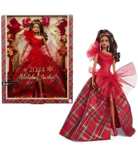 La poupée Barbie Noël 2024 incarne la chaleur et l'ambiance de cette saison avec une robe de fête et un look festif ! Inspirée de cet univers, cette robe est composée d'un haut rouge scintillant drapé sur une épaule et d'une jupe à carreaux style robe de bal. Des touches de tulle apportent une pointe de modernité à un look classique. Présentée dans un emballage du plus bel effet, cette poupée de collection fera un excellent cadeau pour les enfants à partir de 6 ans. Ce coffret comprend un socle pour poupée et un certificat d'authenticité. La poupée ne tient pas debout toute seule. Les couleurs et les décorations peuvent varier. Célébrez l'esprit des fêtes avec la poupée Barbie Noël 2024, parfaite représentation de l'élégance, de la chaleur et de l'harmonie de la saison ! Sa robe rouge drapée à une épaule est ornée de paillettes qui lui permettent de briller à travers l'emballage ! La robe se distingue par une jupe ample à carreaux avec fente tendance sur la jambe, tandis que les boucles d'oreilles argentées ajoutent une touche d'élégance appropriée pour les fêtes ! Sa chevelure châtain volumineuse est réunie en demi-queue. Barbie complète sa tenue de lèvres rouges audacieuses, d'un vernis à ongles doré métallisé et de talons assortis ! Que cette poupée Barbie Joyeux Noël 2024 apporte des moments de paix et de bonheur aux foyers du monde entier ! Avec son joli emballage, c'est une pièce de collection idéale à offrir ou à exposer. Contenu de la boîte Inclut une poupée Joyeux Noël 2024 avec robe, boucles d'oreilles et chaussures, ainsi qu'un socle et un certificat d'authenticité. Qualités et caractéristiques environnementales Ce produit ne présente pas de qualités et caractéristiques environnementales justifiant leur information auprès des consommateurs en application de l'article 13-I de la loi AGEC. ...