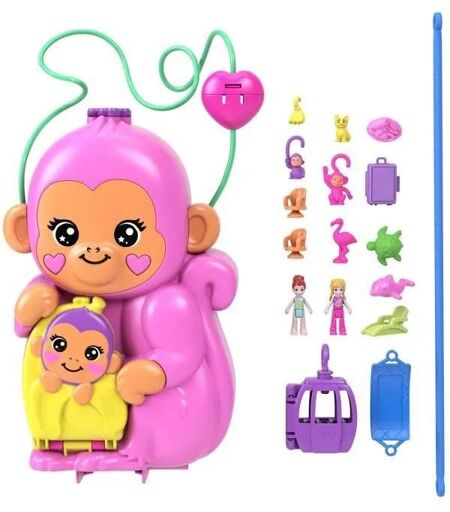 Amusez-vous comme des petits fous avec ce coffret Maman Singe et Son Bébé de Polly Pocket ! Ce coffret 2 en 1 vous réserve une multitude d'aventures ! Le mini-coffret bébé singe se blottit dans la poche de sa maman. Les deux coffrets s'ouvrent pour dévoiler des décors sur le thème de la jungle. L'ensemble comprend 2 mini-figurines et 12 accessoires, dont d'adorables singes. Passez d'un coffret à l'autre avec le téléphérique, plongez dans la piscine, balancez-vous sur le hamac ou dégustez des bananes dans la jungle des bébés singes. Idéal pour s'amuser en voyage : rangez les coffrets et transportez-les sur l'épaule à l'aide de la lanière. Cadeau idéal pour les enfants de 4 ans et plus, surtout s'ils aiment la jungle et partir à l'aventure avec leurs amis animaux ! Les couleurs et les décorations peuvent varier. C'est la folie dans le coffret sac à main Maman Singe et Son Bébé. Le coffret bébé singe se fixe au coffret maman singe au niveau de sa poche ! Ce coffret 2 en 1 permet de s'amuser encore plus avec 2 mini-figurines, Polly et Lila, et 2 scènes de jungle. Il suffit d'ouvrir les coffrets et de les relier à l'aide du téléphérique pour encore plus d'aventure dans la jungle ! Amusez-vous dans la piscine ou détendez-vous dans le hamac avant de prendre le téléphérique pour déguster de délicieux en-cas à la banane avec vos amis dans la jungle des bébés singes. La maison qui se trouve dans le coffret de la maman singe s'ouvre sur deux étages. Elle abrite un lit et une table à manger. Une lanière permet de transporter le coffret comme un sac à main pour emmener la maman singe et son bébé n'importe où ! Avec autant d'activités dans un coffret facile à transporter, ce coffret Polly Pocket est un cadeau idéal pour les enfants à partir de 4 ans, surtout s'ils aiment les animaux et les aventures sauvages ! Contenu de la boîte Inclut 2 coffrets de tailles différentes, 2 mini-figurines, 3 animaux et 10 accessoires. Qualités et caractéristiques environnementales Incorporation de matière recyclée : emballage comportant au moins 64% de matières recyclées en moyenne. Recyclabilité : emballage majoritairement recyclable en séparant les éléments. Attention : Ne convient pas aux enfants de moins de 36 mois. ...