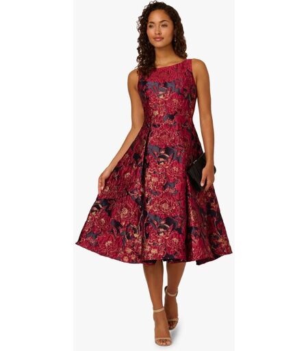 Metallic floral jacquard fabric gives this midi cocktail dress its soft texture and luminous sheen. Princess seams down the bodice meet with skirt pleats at the waist for a sculpted fit and flare silhouette. The boat neckline and midi hemline complete the silhouette with side pockets adding a convenient finishing touch. Classic styling and elevated details combine to make this dress an elegant choice for special occasions and dressy events. Dry clean only. 65% Polyester, 20% Nylon, 15% Metallise ...