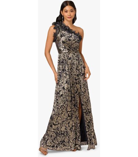 Evoke classic glamor in this shimmering gown. The lightweight textured crinkle fabric features an intricate damask pattern as well as a metallic finish that catches the light with every movement. Structured ruffles along the one shoulder neckline create a dramatic face framing moment. A gathered waistband helps create a defined silhouette in a soft A line cut. Opulent and elegant, this stunning evening dress will turn heads at your next formal event or special occasion. Nettoyage à sec uniquemen ...