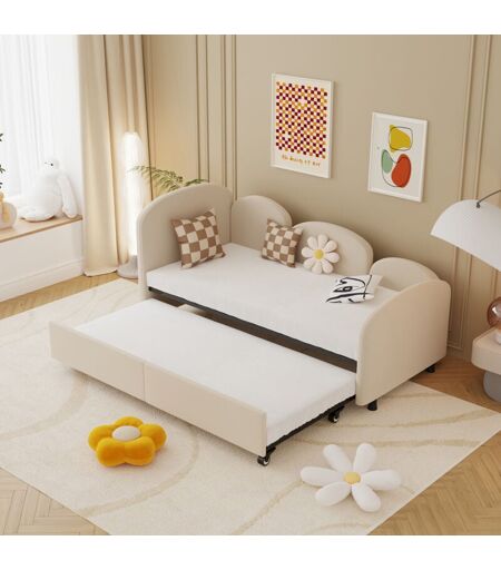NECHE Lit simple rembourré moderne Lit 2 places Lit enfant 90x200 cm Fleurs velours Canapé lit Tête de lit avec Sommier à Lattes Rangement sous lit Beige