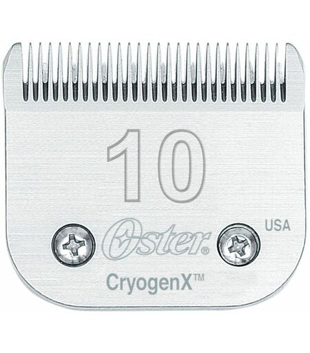 Tête de coupe N°10 CryogenX Oster. Cette tête de coupe est compatible avec tous les modèles de tondeuses utilisant le clip system (Oster, Moser, Wahl, Andis, Heiniger etc). Hauteur de coupe : 1,5 mm Tête de coupe N°10 CryogenX Oster Utilisable sur toutes les tondeuses clip system : Oster, Moser, Andis, Heinger, Wahl, Aesculap (uniquement FAV 5), Hauteur de coupe à 1,5 mm Cette hauteur de coupe (1,5 mm) est à privilégier pour les oreilles, l'abdomen, la queue, l'intérieur des cuisses, gorge et cou, Recommandée pour tous types de poils Conçues aux Etats Unis, ces lames en acier inxoydable sont fabriquées à partir d'un acier à haute teneur en carbone selon des normes rigoureuses. Pour l'entretien de vos têtes de coupe nous vous recommandons d'utiliser le B18 et le dépoussiérant régulièrement afin d'éliminer les poils qui pourraient etre coincés entre les dents Nous vous recommandons de faire affûter vos têtes de coupe régulièrement dès que vous sentez que la coupe n'est plus fluide ...