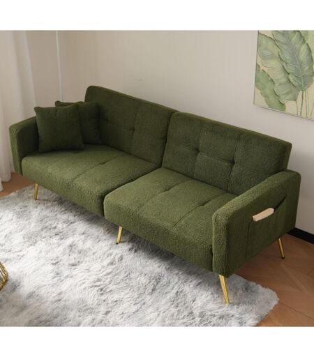YOLEO Canapé 2 Places en Peluche d’agneau,Canapé-lit pliant réglable - Pieds en métal + Poches de rangement - 2 Coussins - 175x64x72cm - Vert