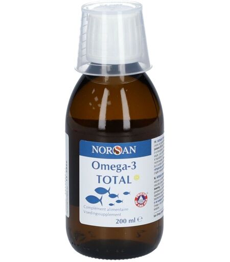 Complément alimentaire à utiliser dans le cadre d’une alimentation variée, équilibrée et d’un mode de vie sain.Bon pour le cœur, la vision et le cerveauOmega-3 Total (200 ml) est une combinaison unique d’huile de poisson naturelle riche en oméga-3 (et particulièrement en EPA) et d’huile d’olive vierge extra issue de l’agriculture biologique (antioxydante). Une dose journalière de 8 ml (soit env. 1 cuillère à soupe) apporte 2000 mg d’acides gras oméga-3 (EPA et DHA) et 800 UI de vitamine D3Il a été démontré que la dose efficace pour réguler un niveau insuffisant d’oméga-3 dans l’organisme est de 2 g d’oméga-3 par jour. C’est pourquoi une dose journalière d’Omega-3 Total apporte 2 g d’oméga-3 EPA & DHA. Il est possible de connaître son niveau d’acides gras oméga-3 en mesurant l’index oméga-3.OMEGA 3 LIQUIDE : RICHE EN ACIDES GRAS EPA & DHAL’huile de poisson provient d’une pêche sauvage et durable. L’huile de poisson est obtenue directement à partir du poisson entier et non comme un sous-produit. Les poissons utilisés dont des petits petits poissons tels que les sardines, les maquereaux et les anchois. La pêche est effectuée selon des directives strictes en matière de pêche durable et est certifiée par le célèbre label “Friends Of the Sea”. L’huile de poisson est purifiée des polluants et des PCB et contrôlée conformément aux strictes réglementations norvégiennes.100 % naturel et sans concentrésL’huile de poisson naturelle contient un complexe de plus de 50 acides gras tel qu’on le trouve dans le poisson. Lors de l’extraction et de la purification de l’huile de poisson, la structure naturelle des acides gras est préservée. Ceci est important car seule la consommation de cette structure naturelle d’acides gras est équivalente à la consommation de poisson. NORSAN renonce délibérément aux processus de concentration chimique qui détruisent le complexe naturel d’acides gras du poisson pour obtenir une concentration artificiellement élevée d’oméga-3.Nettoyage en 3 étapes avec micro-distillationUn nettoyage efficace est primordial pour garantir que l’huile de poisson soit débarrassée des polluants. En général, ce nettoyage se fait en deux étapes. Pour l’huile de poisson contenue dans NORSAN Omega-3 Total, nous recourons à une méthode moderne et unique en trois étapes, qui inclut en plus un processus élaboré de micro-distillation. Ainsi, nous sommes en mesure de proposer une huile la plus qualitative et la plus pure possible.UILE D’OLIVE BIOLOGIQUE COMME ANTIOXYDANTOmega-3 Total contient une huile d’olive biologique vierge extra comme antioxydant.Les olives sont fournies par Rafael, notre oléiculteur, qui travaille selon des directives écologiques. Nous effectuons régulièrement des visites dans la magnifique oliveraie de Rafael en Espagne, car nous pensons qu’une relation étroite permet d’assurer une qualité élevée et constante.Les oméga-3 sont particulièrement “sensibles” et peuvent être facilement détruits. Ils doivent donc être “protégés” non seulement... ...