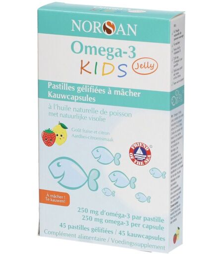 Compléments alimentaires ne peuvent se substituer à une alimentation équilibrée et variée et à un mode de vie sain..Pour le bon développement physique et mental de votre enfantOmega-3 KIDS Jelly sont de délicieuses pastilles gélifiées à mâcher au goût fruité de fraise et de citron. Des omega 3 junior parfaits pour les enfants à partir de 3 ans et bien sûr SANS SUCRE !En plus d’être sans sucre, elles sont également sans additifs artificiels. C’est sain et riche en oméga-3. Une façon simple de garantir à vos enfants un apport suffisant en acides gras oméga-3 EPA et DHA.Les deux acides gras oméga-3 marins EPA et DHA sont importants pour le bon développement de l'enfant. La gelée Oméga-3 KIDS Jelly est composée d'une huile de poisson naturelle, riche en EPA et DHA, issue de la pêche sauvage durable. L'huile de poisson est produite en Norvège et est la même que l'huile Oméga-3 Total.Les petits poissons sont pêchés dans la nature, comme les sardines, le maquereau et les anchois, et la pêche est pratiquée selon des directives norvégiennes strictes (certification Ami de la mer). L'huile de poisson naturelle contient le complexe d'acides gras de plus de 50 acides gras, que l'on trouve également dans le poisson.C'est pourquoi la consommation de gelée est similaire à celle de poisson. Dans le cas de l'huile de poisson, une grande importance est accordée à la fraîcheur de l'huile, de sorte que de la capture à la transformation, il ne s'écoule souvent que 2 à 4 heures. Un processus de traitement et de nettoyage sans oxygène et en douceur garantit la haute qualité et la fraîcheur de l'huile de poisson.Bénéfices250 mg d’oméga-3 par pastille gélifiéeÀ l’huile de poisson naturelle issue d’une pêche sauvage et durableAvec de la vitamine D3Facile à prendre – à mâcher !Au délicieux goût fruité de fraise et de citronSans sucre ajoutéComposition:Huile de poisson naturelle, édulcorants (xylitol et sorbitol), eau, gélatine, arômes naturels de citron et de fraise, régulateur d’acidité (citrate de sodium), antioxydant (acide malique), émulsifiant (lécithine), colorant (extrait de paprika), cholécalciférol (vitamine D3).Valeur nutritionnelle: Pour 2 pastillesHuile de poisson1,5 gAcides gras oméga-3500 mg-dont APE280 mg-DHA134 mgVitamine D310 µgConseils d´utilisation:La dose journalière varie en fonction de l’âge de l’enfant.3-6 ans : 2 pastilles (500 mg d’oméga-3)6-12 ans : 4 pastilles (1000 mg d’oméga-3)Précautions d´emploiL'apport journalier recommandé ne doit pas être dépassé.Conserver dans un endroit frais (6-25 °C) et à l'abri de la lumière. Tenir hors de portée des enfants.Poids net:45 pastilles à mâcherFabricant:San Omega GmbHGubener Str. 4710243 Berlin ...