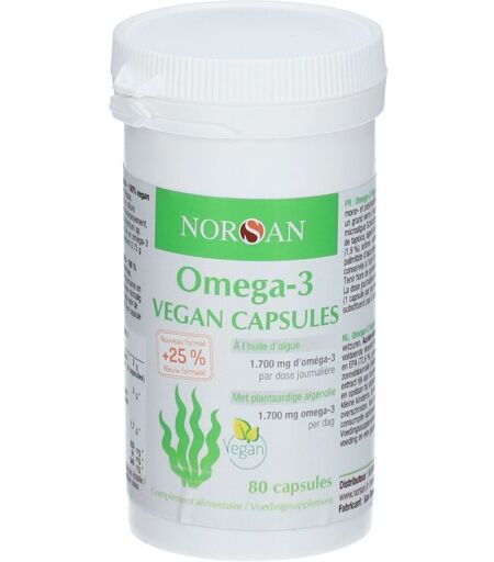 Complément alimentaire à utiliser dans le cadre d’une alimentation variée, équilibrée et d’un mode de vie sain. 1700 mg d’oméga-3 (EPA & DHA) par dose journalière (4 capsules)DHA : 840 mg et EPA : 420 mgHuile végétale d’algue marineCulture non polluante et respectueuse de l’environnementExtrait de romarin comme antioxydantSans refluxIdéal en voyage ou en déplacementOmega-3 Vegan Capsules (80 capsules) contient une huile végétale d’algue. Il s’agit de la même huile d’algue que celle contenue dans la version liquide Omega-3 Vegan. Cette huile est extraite de la microalgue marine Schizochytrium sp. qui est cultivée dans de l’eau de mer artificielle et a une teneur élevée en DHA et EPA. Omega-3 Vegan est 100 % végane.Une dose journalière de 4 capsules apporte 1700 mg d’acides gras oméga-3 marins EPA & DHA. Ainsi, Omega-3 Vegan Capsules permet à tous ceux qui veulent s’alimenter sans consommer de produits d’origine animale de bénéficier d’un apport suffisant en oméga-3 marins DHA et EPA indispensables à la santé et que l’organisme ne peut pas synthétiser.Ou comment puiser les oméga-3 directement à la source ! En effet, on oublie souvent que si les poissons sont sources d’oméga-3 EPA et DHA, c’est parce qu’ils se nourrissent d’algues qui contiennent ces fameux acides gras EPA et DHA ! L’huile d’algue NORSAN provient de la microalgue Schizochytrium sp. qui est particulièrement riche, non seulement en DHA, mais aussi en EPA. L’huile d’algue NORSAN est 100 % végane !Omega-3 Vegan Capsules contient la même huile d’algue que celle contenue dans la version liquide Omega-3 Vegan. Il s’agit d’une huile végétale d’algue extraite de la microalgue marine Schizochytrium sp. qui a la particularité d’avoir une teneur naturellement élevée en acides gras oméga-3 marins DHA et EPA. Omega-3 Vegan Capsules permet donc d’assurer un apport optimal en oméga-3 à tous ceux qui ne veulent pas consommer de produits d’origine animale.Composition: Huile extraite de la microalgue Schizochytrium sp. à teneur élevée en DHA et EPA (72,6 %), amidon modifié de tapioca, agent humectant : glycérine, huile de tournesol, arôme : extrait de romarin, antioxydants : extrait riche en tocophérols et palmitate d’ascorbyle.Valeur nutritionnelles: 4 capsulesHuile d'algue3 g*Acides gras oméga-31,7 g* dont EPA 420 mg dont DPA 91 mg dont DHA 840 mg* Pas de recommandation de dose journalière disponibleConseil d'utilisation:4 capsules par jour à prendre pendant ou après un repas. Une dose journalière contient 1700 mg d’acides gras oméga-3, dont 840 mg de DHA et 420 mg d’EPA. En respectant la dose recommandée, la boîte permet de tenir 20 jours.Précautions d'emploi:Ne pas dépasser l'apport quotidien recommandé indiqué. Les compléments alimentaires ne remplacent pas une alimentation variée et équilibrée et un mode de vie sain.Stockage:Conserver dans un endroit sec, à l'abri de la lumière directe du soleil. Le produit doit être gardé hors de portée des jeunes enfants.Poids net:82,6 g = 80... ...