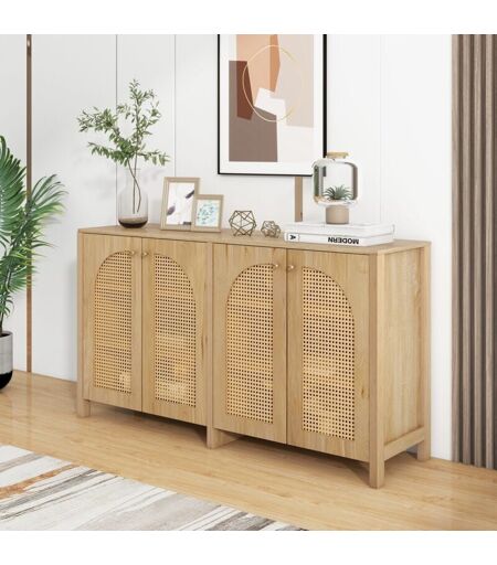 YOLEO Buffet Bas Moderne - 4 Portes en rotin + 6 Étagères - Meuble d'Entrée mdf - Armoire de Salon Etagères réglables - 145x80x40cm Bois Naturel