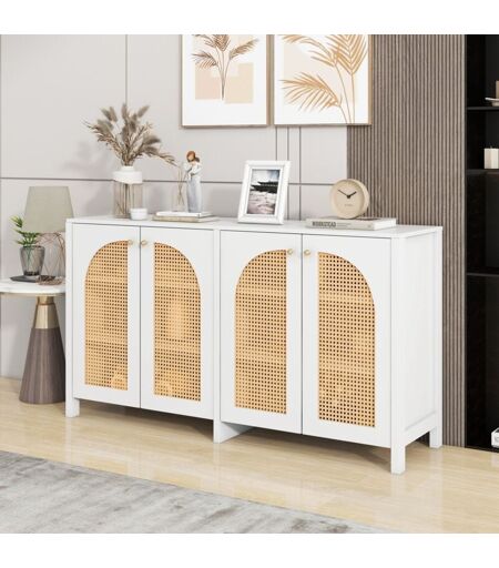 YOLEO Buffet Bas Moderne - 4 Portes en rotin + 6 Étagères - Meuble d'Entrée mdf - Armoire de Salon Etagères réglables - 145x80x40cm Blanc