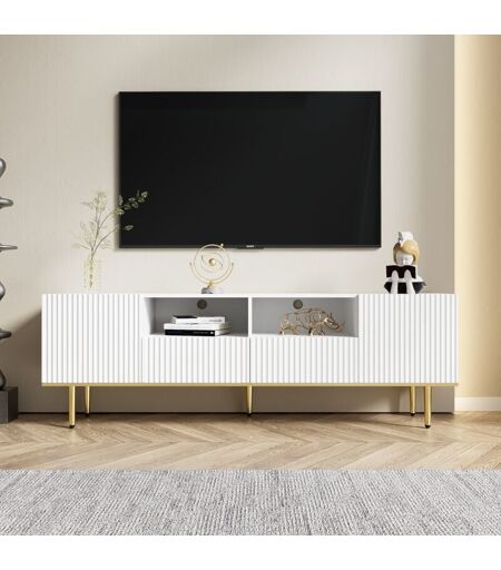 Yoleo - Meuble tv moderne avec bord doré,Portes au design simple à rayures verticales,4 compartiments de rangement et 2 tiroirs,Blanc