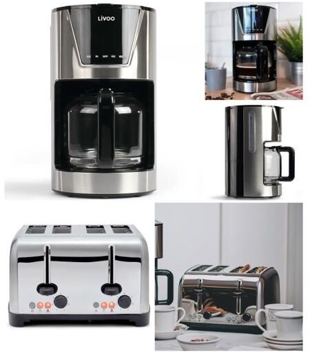 Livoo Cafetière Électrique Programmable Machine À Café 1l5 Inox Grise 900w + Grille-Pain 1700w Inox 4 Fentes Larges