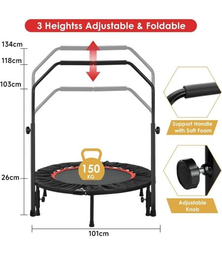 【Grande capacité de charge et bonne élasticité】 32 ressorts renforcés haute performance + cadre en acier de qualité supérieure + tapis de saut en polypropylène + tissu Oxford en PVC garantissent à notre trampoline une élasticité exceptionnelle et une stabilité maximale avec une charge maximale de 150 kg. Profitez d'un saut sûr et confortable pour un entraînement efficace avec une sécurité maximale. 【Trampoline avec poignée】 Ce trampoline de fitness avec poignée en forme de U et réglable en hauteur rend l'entraînement particulièrement adapté aux débutants. Comme la poignée peut être retirée, elle s'adapte à différentes intensités d'entraînement – en même temps, elle reste peu encombrante et facile à déplacer. Support robuste et stable : 6 tubes de pieds épais en acier, équipés de coussinets antidérapants sur le fond, augmentent la stabilité du trampoline, réduisent le déplacement dû à la friction avec le sol lors du saut, améliorent la sécurité tout en protégeant votre sol. Petit ...