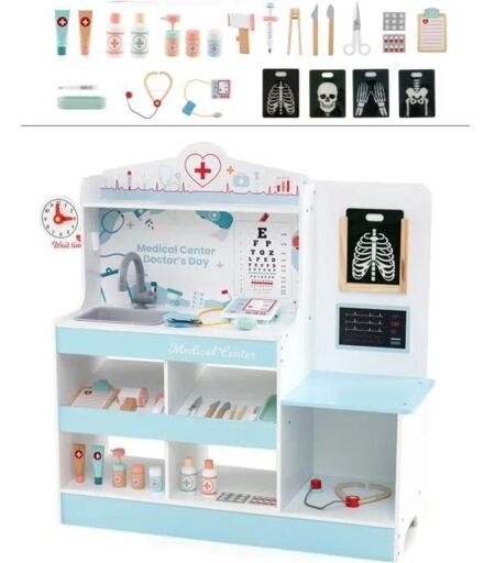 **Nos médecins sont remarquablement réalistes et évoluent dans un environnement médical réaliste comprenant une zone d'examen ECG, un appareil de test de la vue et 24 autres accessoires médicaux, offrant ainsi une multitude d'éléments interactifs. **24 x Accessoires : 1 x tensiomètre, 1 x thermomètre, 1 x seringue, 2 x ciseaux, 2 x scalpels, 1 x pince, 1 x thermomètre auriculaire, 7 x flacons de médicaments, 2 x comprimés, 4 x films radiographiques, 1 x stéthoscope, 1 x carnet de suivi médical **Ce jouet est idéal pour les jeux de rôle imaginatifs et favorise les interactions sociales. ...