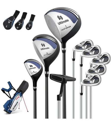 Matériaux des clubs : Alliage d'aluminium, zinc, métal, fibre de carbone, TPR Matériau du sac : Polyester Dimensions du sac : 83 cm x 51 cm x 96 cm (L x l x H) Hauteur du sac avec capuche : 129 cm Hauteur du sac sans capuche : 90 cm Dimensions de la base : 28 cm x 18 cm (L x l) Tous les clubs sont conçus pour les golfeurs gauchers. Tous les bois sont dotés de manches en graphite et d'aides à l'alignement. Le centre de gravité bas assure la stabilité à chaque swing. La base dentelée antidérapante assure la stabilité. Conception portable avec deux bandoulières et poignées de transport. ...