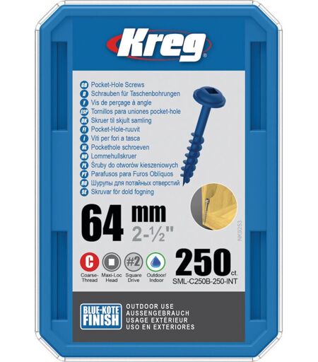 Vis à bois Kreg SML-C250B; Maxi-Loc; 2 50''; 64 mm; 250 pcs.; bleu Code EAN : 647096808426 Marque : Kreg Poids du produit (kg) : 1.04 ...