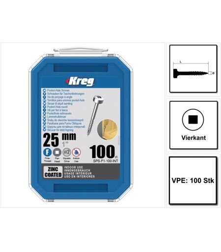 KREG Pocket-Hole Vis en acier zingué avec tête cylindrique 25mm - 100 pièces avec filetage fin ( SPS-F1-100 )