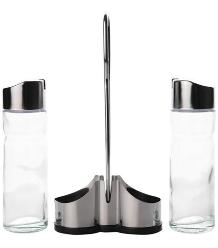 Ménagère huile & vinaigre Ménagère de 2 pièces, huilier et vinaigrier en verre avec un couvercle. Le support de cette ménagère est en acier inox avec base en plastique noir. Dimensions (L x P x H) mm : 106 x 100 x 218 ...