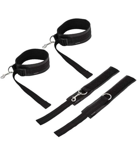 Ce kit est composé de 4 attaches noires ajustables, 2 pour les poignets et 2 pour les cuisses que vous pourrez accrocher ensemble. Vous pourrez ainsi soumettre totalement votre partenaire et réaliser vos fantasmes ensemble ! Très douces, elles garderont votre partenaire en place avec confort. Il ne vous reste plus maintenant qu'à laisser libre cours à votre imagination... ...