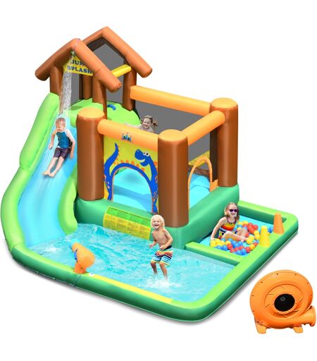 CostwayAire de Jeux Château Gonflable Enfant avec Souffleur 610W Pataugeoire Mur d'Escalade Canon à Eau Trampoline Intégré Balles Colorées