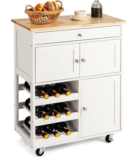 COSTWAY Desserte de Cuisine en Bois d’Hévéa et en MDF à Roulettes avec Tiroir, Porte-Bouteilles à 3 niveaux et 2 Placards Blanc