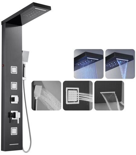 ROVOGO Colonne Panneau de Douche Hydromassante Noir avec LED, 5 Modes - Pomme de Douche Cascade et Pluie, Jets de Massage, Douchette à Main et Bec de
