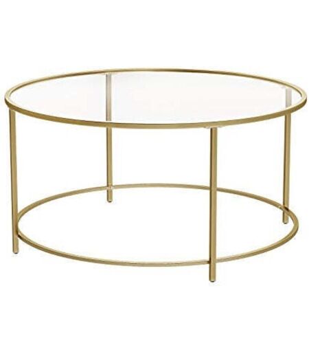Modern Gold Coffee Table: Elevate your living space with a stylish coffee table featuring a rounded, gold-coloured steel frame and a tempered glass top. Perfect for adding a touch of modern elegance to your home decor. Durable and Stable Design: This gold coffee table boasts a robust construction with 2 rings and 4 legs made of powder-coated steel, ensuring a stable and long-lasting addition to your living room furniture. Tempered Glass Surface: The coffee table's surface is made of 6 mm thick tempered glass, offering exceptional durability and shock resistance. It can support up to 70 kg, making it both delicate in appearance and strong in function. Adjustable Feet for Any Floor: Whether placed on carpet or hardwood, the adjustable feet of this modern coffee table compensate for minor unevenness and protect your floors from scratches. Easy Assembly: Enjoy hassle-free assembly with numbered parts and detailed instructions. You'll have your new glass coffee table set up in no time. ...
