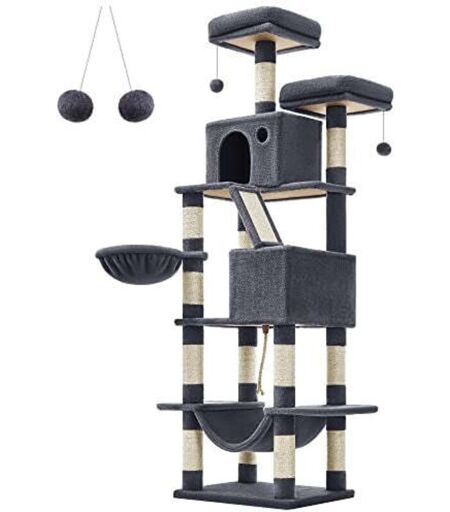 [206 cm Tall, Endless Climbing Fun] 206 cm tall cat tree. 5 levels. Short 30-40 cm distance between levels. This plush cat tree is perfect for cats who love climbing and high places, but also easy to climb up and down [All-in-One Cat Playground] With 2 well-padded cat perches, 2 cosy cat caves, 1 fluffy basket, 2 pompoms, and 1 hammock with 1 play rope above, your little furballs can always find comfort and fun wherever they stay on this multi-level cat tower [Stable, Safe, Secure Cat Condo] Crafted with quality particleboard, equipped with a large base with reinforced bottom battens, and secured by an anti-tip kit, this tall cat condo is stable and safe for up to 6 cats (max. 7 kg each) to play [13 Scratching Posts & 1 Scratching Ramp] With scratching areas on each level, your cats can scratch to their hearts' content and let your sofa go! Plus, the scratching ramp doubles as a ladder to help kittens and elderly cats climb up easily [A Pompom to Spare] If your cats get a little too ...