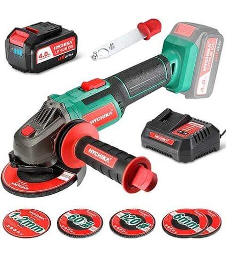 Meuleuse D'angle 18V, HYCHIKA 4.0Ah Meuleuse Sans Fil à Charge Rapide Avec 5 Disques de 115mm 8500RPM, Poignée Réglable à 3 Positions, Alimentée par Batterie, Idéale pour Meuler et Couper