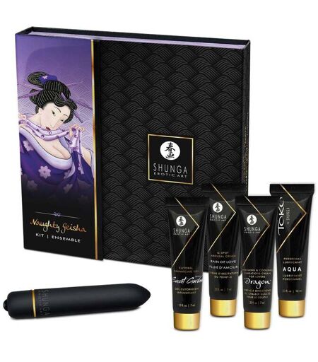 Explorez votre coté coquin avec le Coffret Geisha Coquine de Shunga ! Cet ensemble de 5 produits enflammera vos moments de sensualité et vous aidera à repousser les limites de vos plaisirs ! Idéal pour les escapades amoureuses, cet ensemble contient des recettes merveilleuses pour vivre de nouvelles sensations. Avec son format pratique, il peut vous suivre dans tous vos voyages, y compris dans les avions. Seule ou avec la complicité de votre partenaire, découvrez des orgasmes extraordinaires grâce aux produits de haute qualité de Shunga. Le coffret contient : * 1 Lubrifiant Eau Toko Aqua (10 ml) À base d’eau - Ultra soyeux - Ne tache pas - Extra longue durée. * 1 Gel Clitoridien Jardin Secret (https://www.espaceplaisir.fr/shunga-jardin-secret.html) (7 ml) Intensifie l’orgasme - Augmente la fréquence des orgasmes - Réhausse la lubrification. * 1 Crème Intensifiante Dragon (https://www.espaceplaisir.fr/shunga-creme-intensifiante-dragon.html) (7 ml) Effet « Feu de Glace » - Mélange de plantes et d’extraits naturels - Texture lubrifiante. * 1 Crème d'excitation du Point G Pluie d'Amour (https://www.espaceplaisir.fr/shunga-pluie-d-amour.html) (7 ml) Aide à la stimulation du Point G - Rehausse la lubrification - Favorise l’éjaculation féminine - Contient des huiles naturelles. * 1 Stimulateur Bullet Vibrations intenses - 10 vitesses - Fonctionne avec 1 pile AAA non incluse. ...