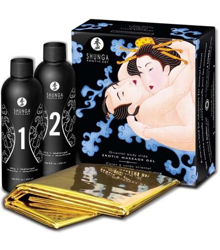 Plongez dans une expérience sensorielle aussi ludique qu'excitante avec la gelée de massage Corps à Corps Oriental fruits exotiques de Shunga. Inspirée des rituels traditionnels asiatiques, cette gelée transforme un simple massage en une véritable chorégraphie de corps glissants et de caresses en apesanteur. Une immersion délicieusement érotique où chaque geste devient fluide, chaque mouvement sensuel, chaque contact irrésistiblement stimulant. À mélanger à de l'eau chaude pour obtenir jusqu'à 4 litres de gelée tiède, ce produit unique se verse généreusement sur deux corps nus et crée une texture soyeuse à souhait. Les corps glissent l'un contre l'autre avec une douceur enveloppante, réveillant les sens et décuplant les sensations. Disponible en trois parfums gourmands : melon mangue, fruits exotiques et vin pétillant à la fraise. La gelée embaume l'air d'un sillage sucré et aphrodisiaque. La formule est à base d'eau, végétalienne, compatible avec le latex et les sextoys en silicone. Elle est également embrassable, sans sucre ajouté et se rince facilement à l'eau. Le tout est accompagné d'une couverture dorée étanche et d'instructions détaillées pour créer un véritable bassin de plaisir directement au sol. L'installation devient un jeu en soi, un prélude complice à l'aventure sensorielle qui s'annonce. Conçue pour les amants qui souhaitent sortir des sentiers battus, la gelée Corps à corps de Shunga promet un moment d'abandon total, entre rire, excitation et tendresse infinie. Ingredients (I.N.C.I.): Bottle/Bouteille #1: Demineralized Water/Eau déminéralisée (Aqua), Acrylates / C10-30 Alkyl Acrylate Crosspolymer, Glycereth-2 cocoate, Artificial Flavor/Saveur artificielle (Aroma), Benzoic Acid, Sodium PCA, DMDM Hydantoin, Aloes Vera (Aloes Barbadensis Leaf Juice), Sodium saccharin. Colors for/Couleurs pour : EXOTIC FRUITS/FRUITS EXOTIQUES: FD&C; Blue/Bleu #1 (CI 42090). MELON-MANGO/MELON-MANGUE: FD&C; Yellow/Jaune #6 (CI 15985). STRAWBERRIES & CHAMPAGNE/ FRAISES ET CHAMPAGNE: FD&C; Red/Rouge #40 (CI 16035). Bottle/Bouteille #2: Demineralized Water/Eau déminéralisée (Aqua), Glycerin USP/Glycérine USP, Triethanolamine. ...